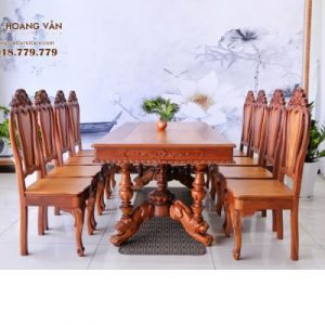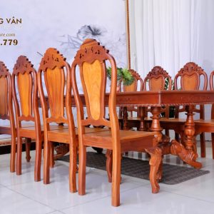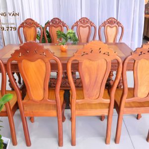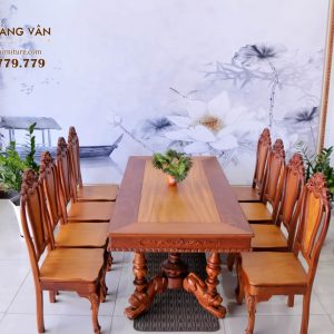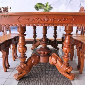 Với sự kết hợp tinh tế giữa mặt bàn gỗ gõ nguyên tấm và chân bàn chạm sư tử nhỏ, bộ bàn ăn gỗ căm 8 ghế này thu hút sự quan tâm của nhiều người. Sự sang trọng, cổ điển và ý nghĩa phong thủy của nó làm cho mẫu bàn ăn trở thành lựa chọn ưu tiên cho không gian phòng ăn, đem lại không chỉ vẻ đẹp mà còn niềm tin vào vận may và tài lộc.
