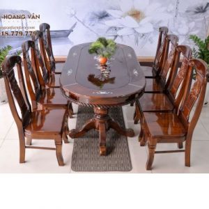 Mặt bàn hình oval bo tròn xung quanh, mang lại cảm giác mềm mại, thân thiện. Phần trên mặt bàn được cẩn ốc hoa văn tinh tế, tạo điểm nhấn cho thiết kế của bộ bàn ăn gỗ tràm tự nhiên này.