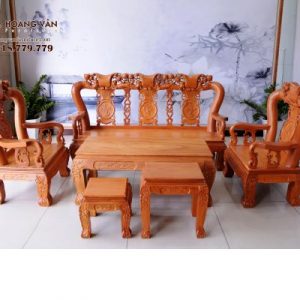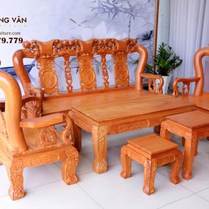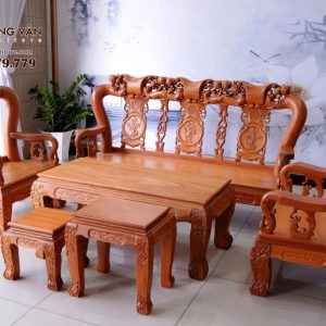 Gỗ gõ, với độ bền và tính thẩm mỹ cao, tôn lên sự sang trọng cho không gian phòng khách. Họa tiết đào tinh xảo được chạm khắc tỉ mỉ trên bề mặt bàn và ghế, tạo điểm nhấn độc đáo, thu hút ánh nhìn mà vẫn giữ được vẻ đẹp truyền thống và sự trang nhã.