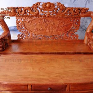 Trên lưng ghế của bộ salon, việc chạm khắc các bức tranh phong cảnh thiên nhiên hùng vĩ, chốn bồng lai tiên cảnh không chỉ làm tăng tính thẩm mỹ mà còn mang lại cảm giác bình yên và thư giãn. Sự kết hợp giữa họa tiết rồng và những bức tranh thiên nhiên tạo nên một sức hút đầy ma mị và quyền lực, khiến mẫu sản phẩm này trở thành lựa chọn yêu thích của nhiều gia chủ.