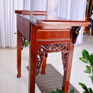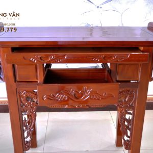 Đây là mẫu bàn cúng được làm từ gỗ căm xe, mặt gõ đỏ. Như bạn biết, gỗ căm xe là một loại gỗ khá quen thuộc trong thị trường nội thất tại Việt Nam. Gỗ căm xe được coi là loại gỗ quý chỉ được dùng cho những món nội thất riêng biệt và giá cả khá cao vì thế không mấy phổ biến trên thị trường nội thất hiện đại ngày nay.