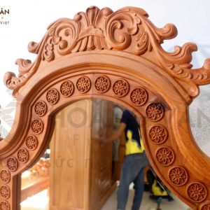 Điểm đặc sắc của BTĐGC001 là họa tiết cong uốn lượn, cùng hình ảnh bông hoa cánh lá khắc họa nổi bật, thể hiện sự tỉ mỉ và tinh tế trong từng chi tiết. Bên cạnh gương, hai cột đứng chắc chắn tạo nên nét đẹp độc lạ, gây ấn tượng mạnh cho bất kỳ ai khi bước vào phòng.