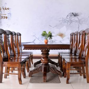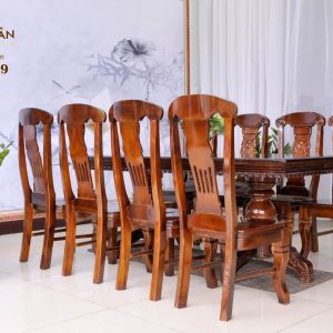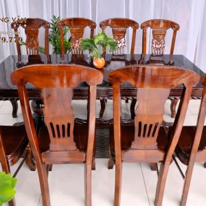 Điểm nổi bật nhất của bộ bàn ăn gỗ tràm BAT8G003 này chính là thiết kế của các chiếc ghế. Đây không chỉ đơn thuần là nơi ngồi mà còn là điểm nhấn tinh tế. Với chân cong tinh xảo và lưng ghế được chạm khắc với họa tiết rồng độc đáo, mỗi chiếc ghế trở thành một tác phẩm nghệ thuật riêng biệt. Sự kết hợp tinh tế giữa gỗ tràm đỏ và phong cách phương Tây tạo nên một diện mạo sang trọng và độc đáo.