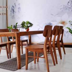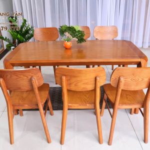 Đi kèm với mặt bàn là 6 chiếc ghế thiết kế độc đáo, tựa lưng được lấy cảm hứng từ đôi tai voi – một nét chấm phá đầy nghệ thuật, mang lại sự thoải mái tối đa cho người sử dụng. Phần tựa lưng lớn và cao giúp hỗ trợ cột sống, tạo cảm giác thư thái khi ngồi lâu, lý tưởng cho những buổi tụ họp gia đình hoặc các dịp lễ tết. Ghế cũng được làm từ gỗ sồi tự nhiên, gia công tỉ mỉ, chắc chắn, tạo nên sự hài hòa, đồng điệu với bàn.
