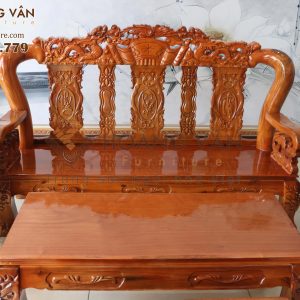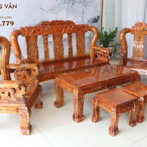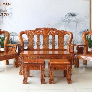 Bộ bàn ghế salon phòng khách SLTHTCT002 không chỉ là một bộ nội thất thông thường mà còn là một tác phẩm nghệ thuật tinh xảo. Họa tiết cuốn thư kết hợp với hình rồng, cùng với bộ chữ “Phú – Quý – Phúc – Lộc – Thọ” tại vị trí lưng ghế, tạo nên điểm nhấn độc đáo và đầy ý nghĩa cho không gian phòng khách của bạn.