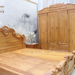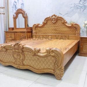 Giường gỗ gõ hoa mai lấy ý tưởng thiết kế theo phong cách hoàng gia với các họa tiết nổi hình hoa mai thể hiện ý nghĩa một khởi đầu mới. Kết hợp với họa tiết hoa lá tây lại càng giúp cho mẫu giường này trở nên trở sang trọng và cổ điển hơn.