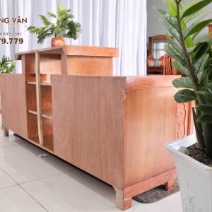 Các nghệ nhân đã khéo léo đục đẽo hình dáng bông hoa mai năm cánh sắc nét và góc cạnh vuông vức, mang lại vẻ đẹp gần gũi và đậm chất truyền thống Việt Nam. Sự kết hợp hoàn hảo giữa các chi tiết chạm khắc và cấu trúc chắc chắn khiến chiếc kệ tivi trở thành điểm nhấn ấn tượng trong mọi không gian.