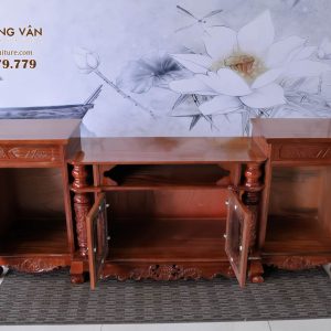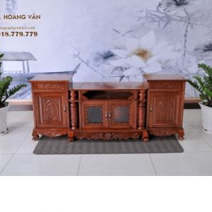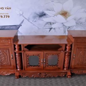 Bên cạnh đó, sản phẩm còn mang nét đẹp riêng nhờ màu sắc cánh gián đặc trưng của chất gỗ xoan cùng những đường vân gỗ đẹp mắt. Sản phẩm trông khá cầu kỳ bởi những họa tiết hoa văn được chạm trổ tỉ mỉ, tinh tế trên bề mặt của chiếc kệ tivi. Bức tranh thiên nhiên cây lá được các nghệ nhân đục đẽo sắc nét tô điểm cho chiếc kệ gỗ thêm phần nổi bật gây ấn tượng người dùng khi ghé thăm nhà bạn.