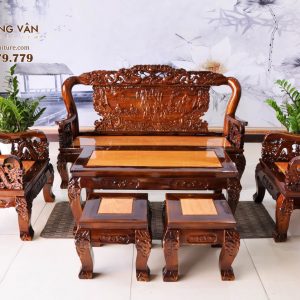 Họa tiết rồng trên bộ bàn ghế tràm gõ không chỉ đơn thuần là một điểm nhấn thẩm mỹ mà còn mang lại nhiều ý nghĩa sâu sắc. Rồng, trong văn hóa Á Đông, tượng trưng cho sức mạnh, quyền lực và sự thịnh vượng. Đặc biệt, họa tiết bát tiên được khắc tinh xảo, đại diện cho tám vị tiên trong nhân gian, mỗi vị mang đến một ý nghĩa riêng. Theo quan niệm phong thủy, bát tiên giúp gia chủ tăng cường sức mạnh, tránh khỏi bệnh tật và thu hút may mắn, thuận lợi trong sự nghiệp.