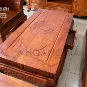 Bàn có bề mặt lớn được đục một cách tỉ mỉ, tạo ra họa tiết đồng văn liền mạch, và xung quanh có bo khuôn tranh dày 4 phân, tăng thêm tính thẩm mỹ và sự sang trọng.