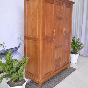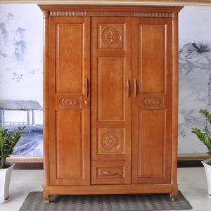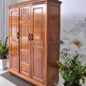 Mặt trước của tủ được thiết kế với các chi tiết điêu khắc sống động, đặc biệt là hình bông hoa được chạm trổ tinh tế. Những chi tiết này không chỉ làm tăng tính thẩm mỹ mà còn mang lại sức sống cho không gian phòng ngủ, khiến cho tủ không chỉ là nơi lưu trữ quần áo mà còn là một điểm nhấn nghệ thuật. Đường chạm khắc mỉ mỉ trên tủ thể hiện sự tinh xảo và khéo léo của người thợ, đồng thời thể hiện giá trị của sản phẩm.