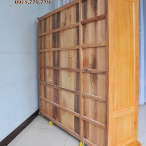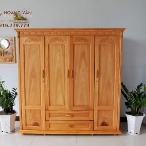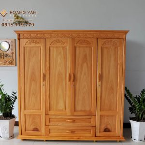 Tủ quần áo gỗ gõ đỏ thiết kế 4 cánh, kích thước lớn chiều ngang 2m và cao 2m. Mỗi cánh tủ đều được làm từ những tấm gỗ lớn với vân gỗ cực đẹp, phía trên được chạm khắc hoa văn tinh tế. Hoa văn hình vòm được chạm khắc phía trên mỗi cánh tủ chính là điểm nhấn hoàn hảo cho thiết kế.