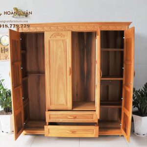 Tủ 4 cánh với 3 buồng rộng rãi, có phân chia ngăn chứa đồ tiện ích. Cùng với 2 hộc kéo phía dưới. Để tạo sự đồng nhất cho thiết kế tủ quần áo gỗ gõ đỏ, nhà sản xuất đã lắp đặt phần tay nắm từ gỗ gõ. Tất cả các linh phụ kiện đều được lắp ráp vừa vặn, đảm bảo chắc chắn khi sử dụng.