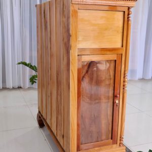 Tủ thờ gỗ gõ tự nhiên với kích thước 130cm, hình thức khá đơn giản. Không sử dụng quá nhiều hoa văn để làm đẹp nhưng mẫu tủ thờ gỗ gõ vẫn thu hút mọi người. Thiết kế tủ thờ gỗ gõ phần bụng hơi phệ tôn lên nét đẹp sang trọng cho món đồ. Cùng với 4 chân mỏng được làm cách tân vô cùng đẹp mắt.