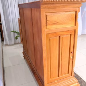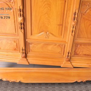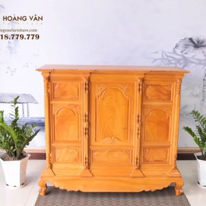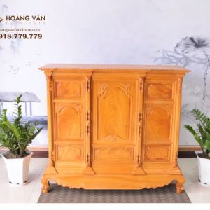 Phần chân tủ được điêu khắc cách điệu khá đẹp mắt và có thể tháo rời vô cùng tiện lợi. Không những thế, với mặt tủ rộng, bạn không còn lo thiếu diện tích mỗi khi đặt đồ cúng như các loại tủ nhỏ khác. Hai bên hông tủ cũng được trang bị hộc để đồ bao gồm chìa khóa tiện dụng để cất giữ những đồ vật cần thiết.